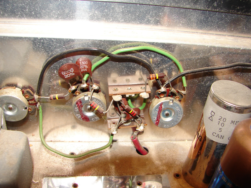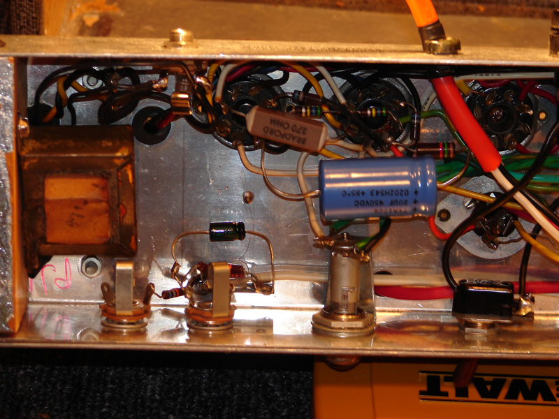 Wiring is point to point using tag pieces. The choke (?) was attached to the speaker; I moved it under the chassis. Speaker was wired directly to the OT via 10-foot lamp cord; I removed it and added a speaker jack. |